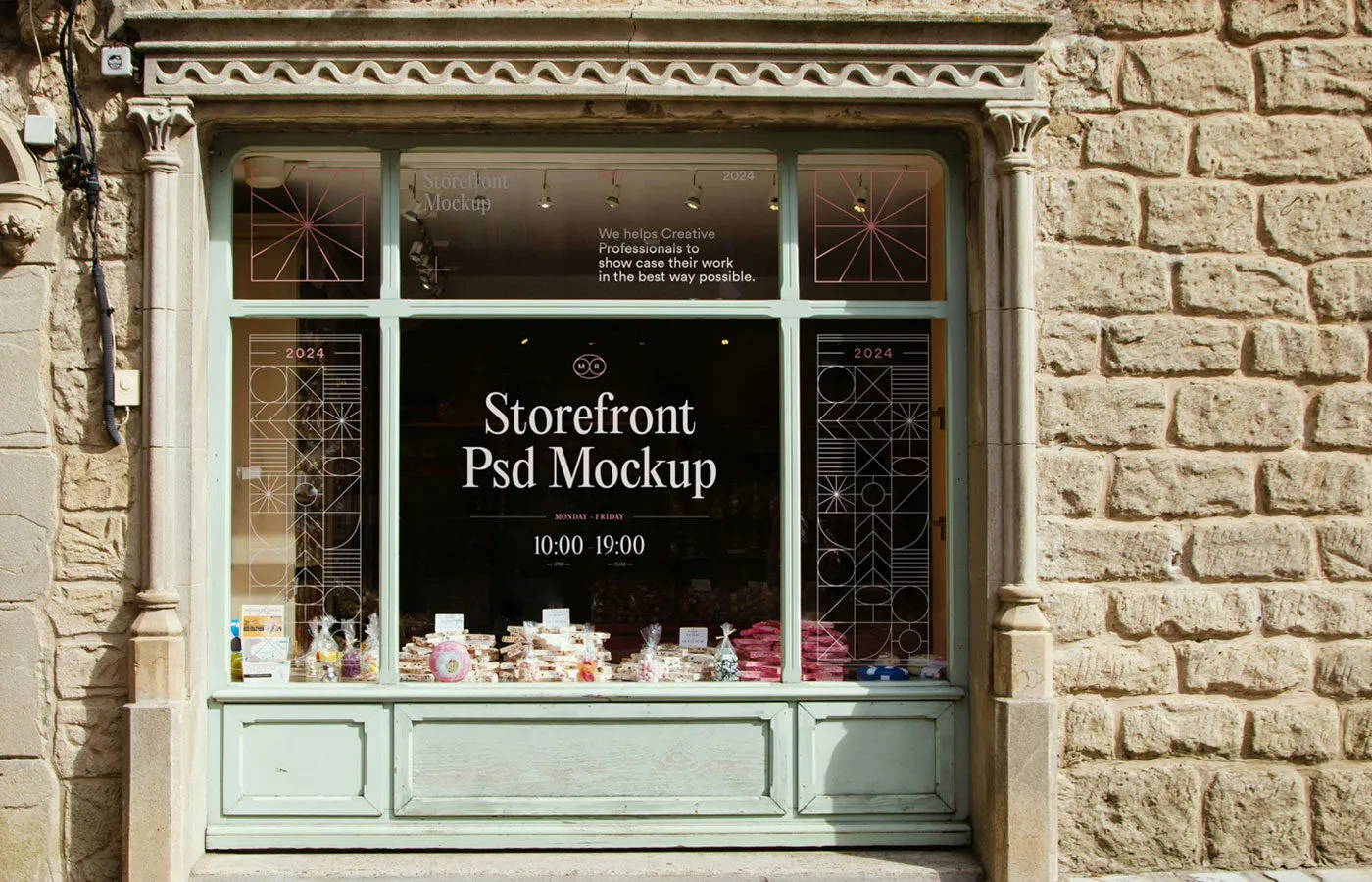 Create a welcoming storefront appearance with the Wood Storefront Mockup. This PSD file allows you to display your business signage on a beautifully decorated window, highlighting rustic charm and artisanal quality. You can easily add your logo and branding using smart object layers to achieve a seamless carved or painted effect with natural wood grain texture and soft daylight.